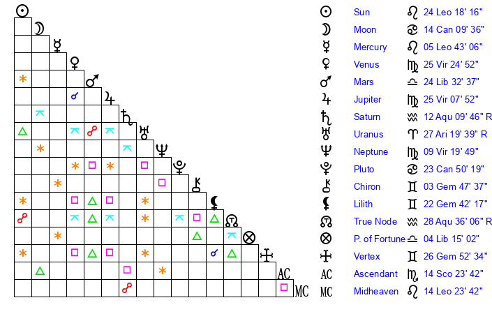 | Sun | 24 Leo 18 | 25 Leo 2 | 24 Scorpio 54 |