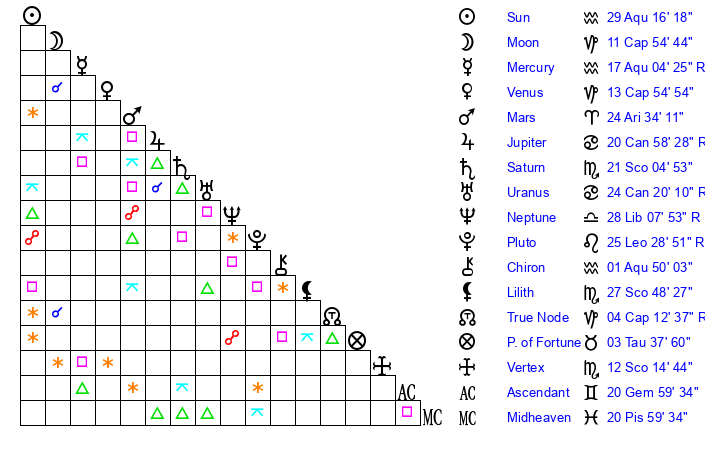 | Saturn | 21 Scorpio 34 | 19 Pisces 22 | 19 Scorpio 7 |