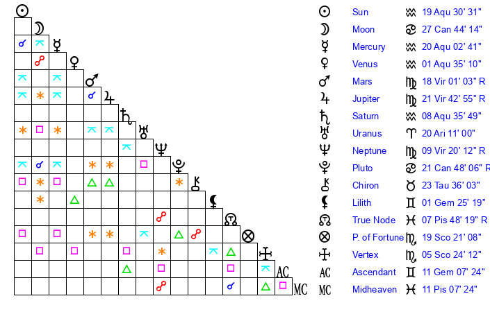 | Saturn | 8 Aquarius 46 | 18 Pisces 13 | 16 Aquarius 21 |
