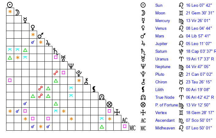 | Uranus | 19 Aries 16 | 1 Gemini 10 | 16 Aries 11 |