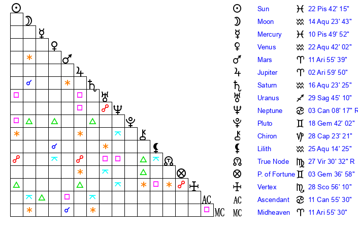 | Sun | 22 Pisces 42 | 23 Pisces 22 | 19 Cancer 52 |