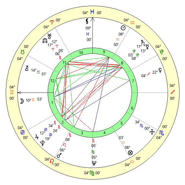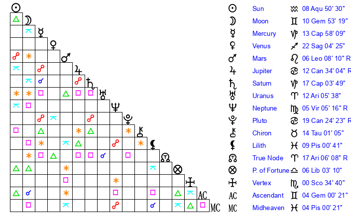 Moon | 10 Gemini 54 | 12 Aquarius 20 | 2 Sagittarius 15 |