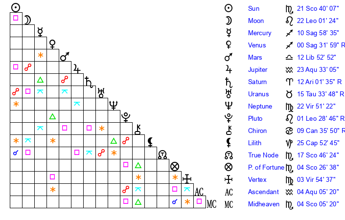 | Sun | 21 Scorpio 40 | 22 Scorpio 34 | 20 Aquarius 3 |