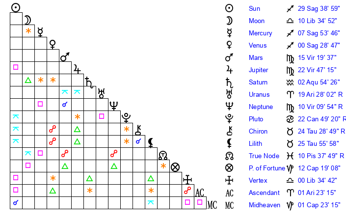 | Moon | 10 Libra 38 | 17 Virgo 1 | 3 Pisces 36 |