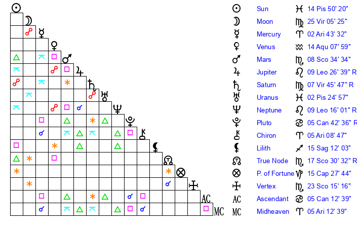 | Saturn | 8 Virgo 32 | 21 Pisces 11 | 7 Virgo 1 |