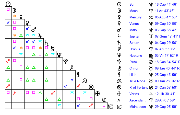| Sun | 16 Capricorn 42 | 17 Capricorn 39 | 22 Aries 3 |