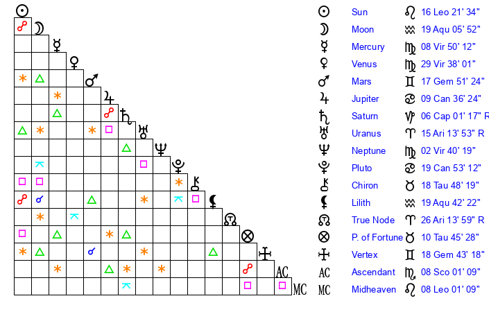 | Moon | 19 Aquarius 7 | 22 Aquarius 9 | 8 Leo 48 |