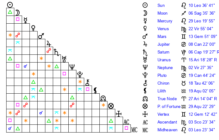 | Mercury | 29 Leo 20 | 7 Leo 4 | 13 Scorpio 19 |