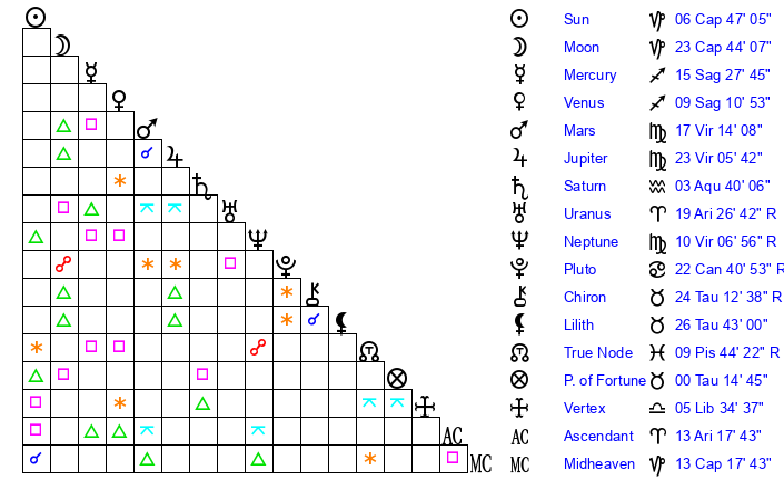 | Moon | 23 Capricorn 42 | 10 Sagittarius 59 | 0 Gemini 49 |