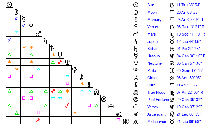 | Sun | 11 Taurus 36 | 12 Taurus 32 | 6 Virgo 37 |