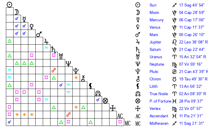 | Sun | 17 Sagittarius 41 | 19 Sagittarius 8 | 21 Pisces 55 |