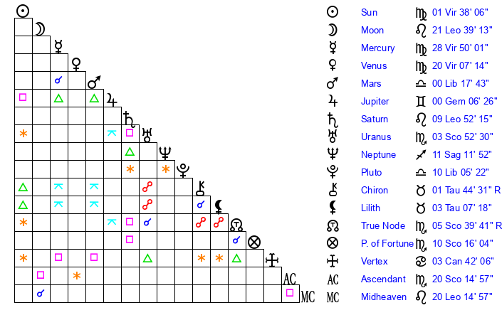 | Moon | 21 Leo 35 | 18 Virgo 54 | 8 Gemini 15 |