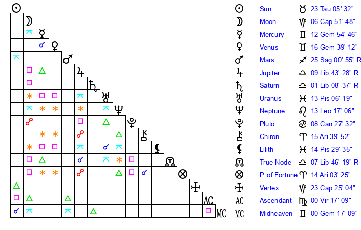 | Moon | 6 Capricorn 54 | 16 Sagittarius 18 | 11 Libra 37 |