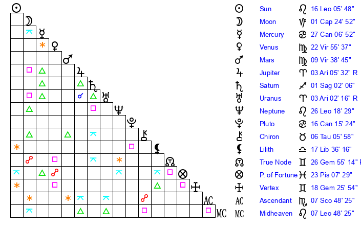 | Neptune | 26 Leo 19 | 1 Aries 50 | 29 Leo 7 |