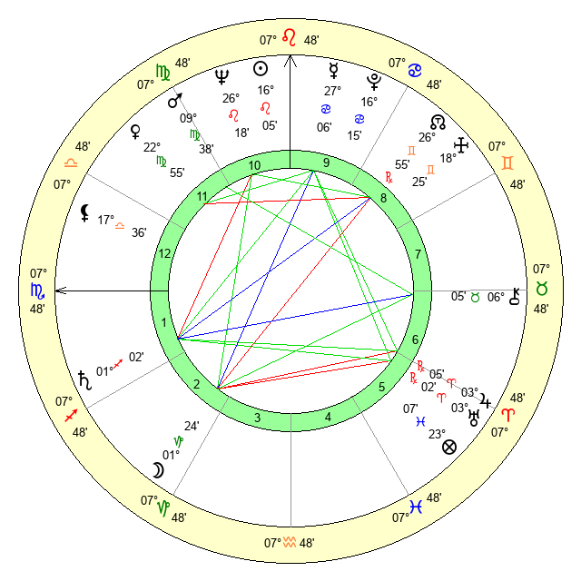 | Venus | 22 Virgo 55 | 11 Cancer 6 | 5 Libra 46 |