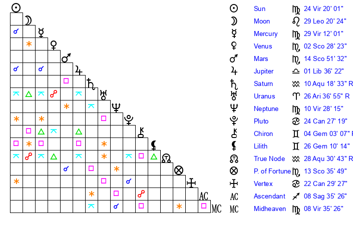 | Neptune | 10 Virgo 28 | 0 Aries 54 | 12 Virgo 22 |