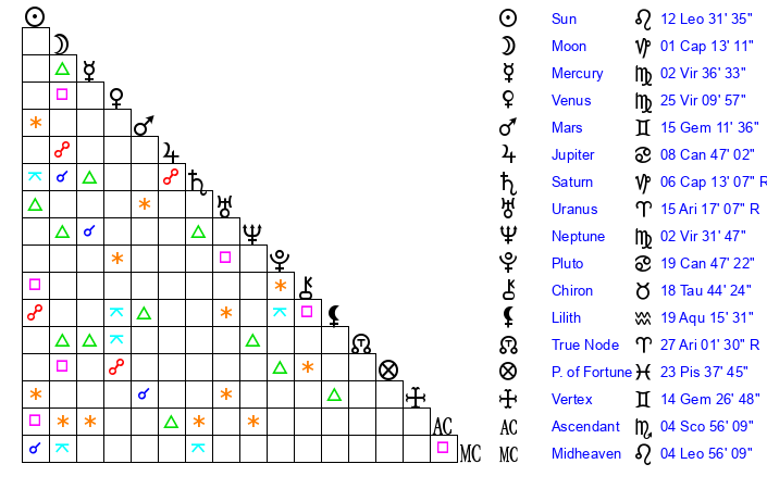 | Moon | 1 Capricorn 12 | 29 Sagittarius 56 | 13 Gemini 23 |