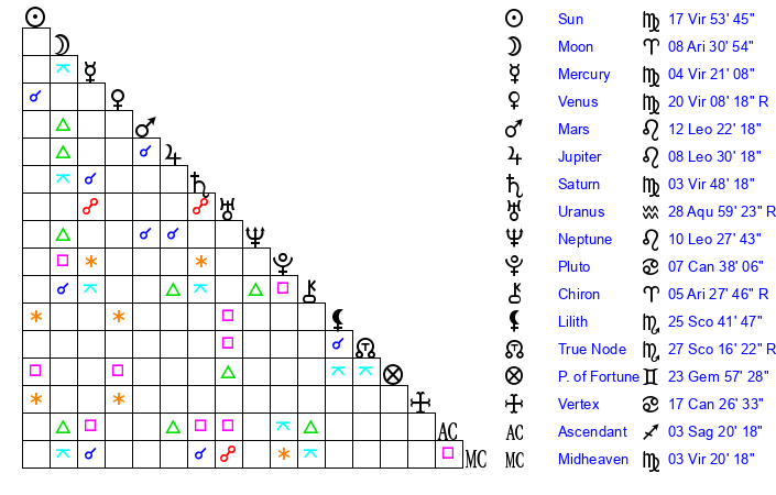 | Sun | 17 Virgo 53 | 19 Virgo 12 | 3 Capricorn 53 |