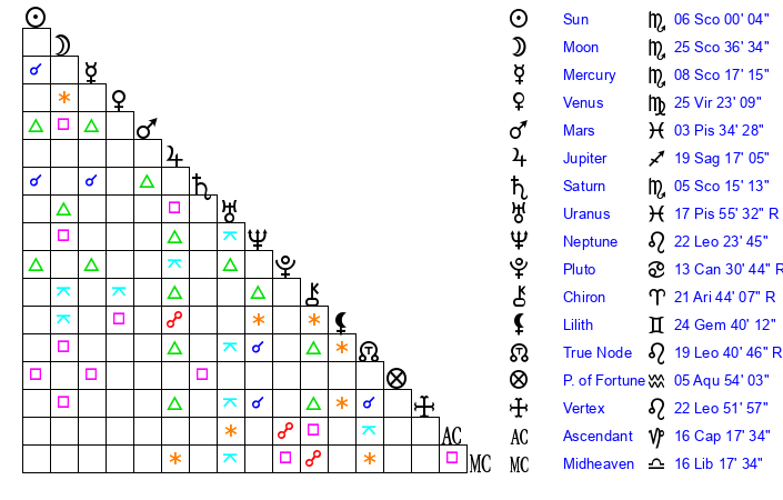 | Saturn | 5 Scorpio 46 | 25 Pisces 48 | 14 Scorpio 40 |