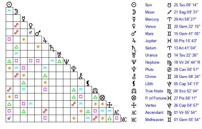 | Sun | 25 Taurus 9 | 26 Taurus 4 | 18 Leo 20 |