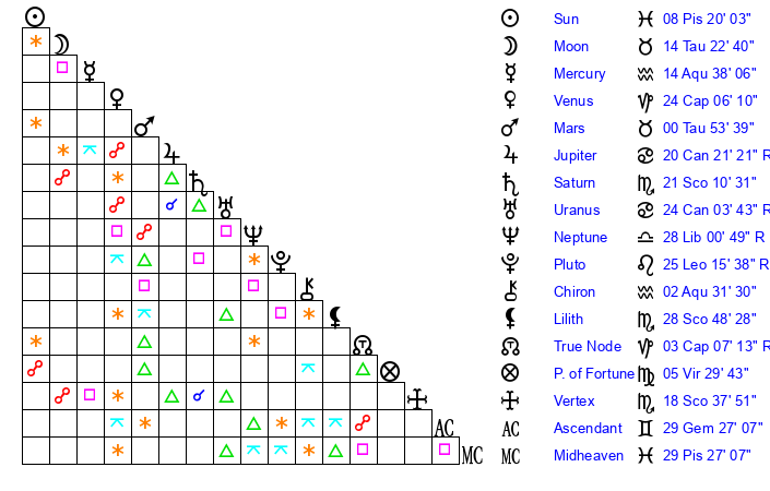 | Moon | 14 Taurus 22 | 4 Pisces 55 | 6 Sagittarius 40 |