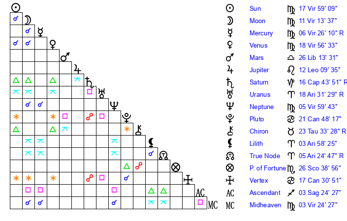 | Moon | 11 Virgo 8 | 12 Taurus 32 | 27 Aquarius 5 |