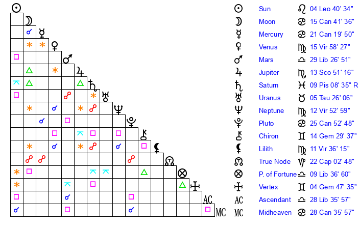 | Moon | 15 Cancer 32 | 23 Virgo 28 | 24 Libra 21 |