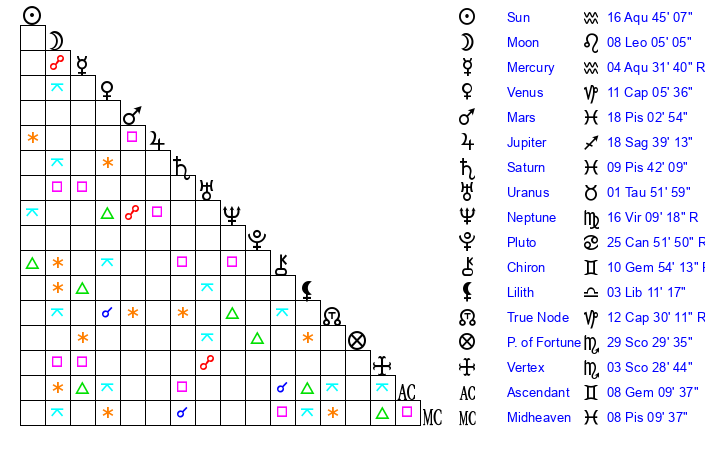 | Sun | 16 Aquarius 44 | 18 Aquarius 9 | 15 Taurus 0 |