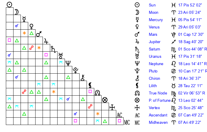 | Sun | 17 Pisces 52 | 18 Pisces 22 | 26 Gemini 11 |