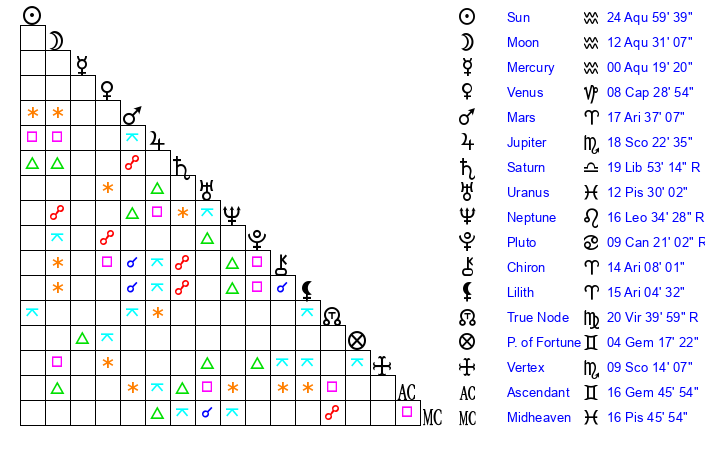 | Sun | 24 Aquarius 59 | 26 Aquarius 15 | 5 Gemini 22 |