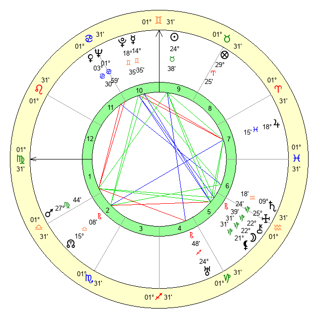 | Mars | 27 Virgo 43 | 13 Leo 9 | 25 Scorpio 19 |