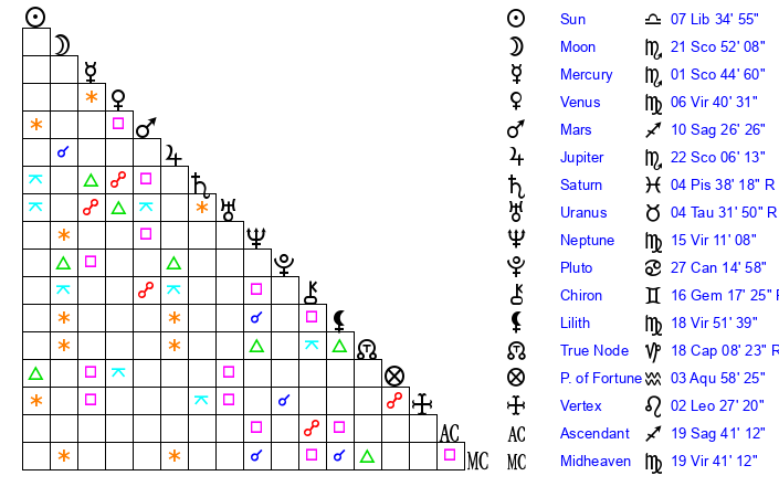 | Moon | 21 Scorpio 57 | 28 Capricorn 27 | 12 Pisces 33 |