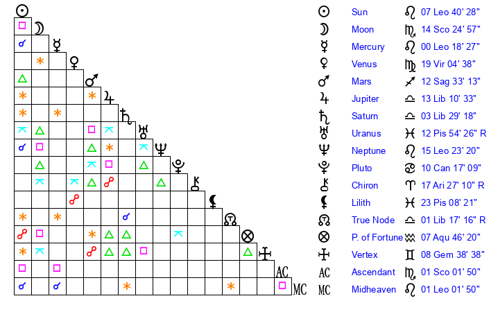 | Neptune | 15 Leo 23 | 1 Aries 58 | 18 Leo 9 |