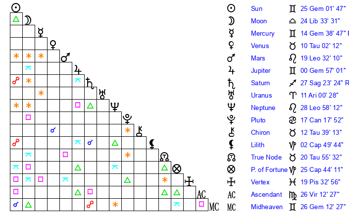 | Mercury | 14 Gemini 39 | 14 Cancer 37 | 22 Libra 4 |