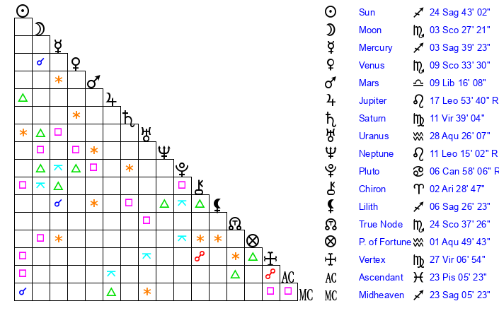 | Moon | 3 Scorpio 27 | 0 Sagittarius 8 | 20 Virgo 39 |