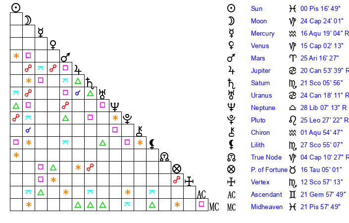 | Saturn | 21 Scorpio 35 | 19 Pisces 30 | 19 Scorpio 3 |