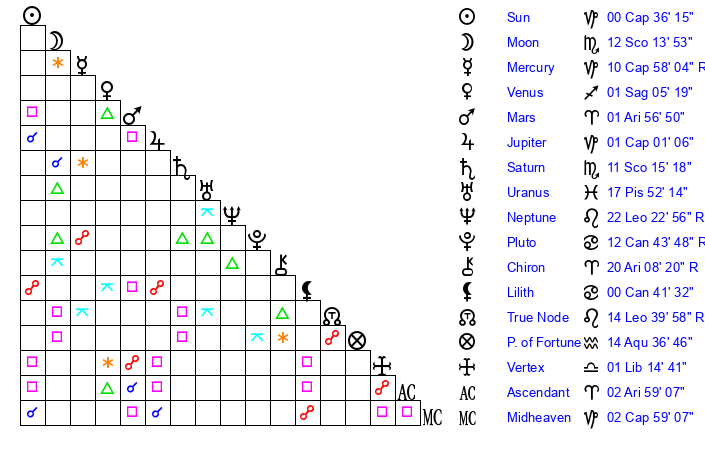 | Sun | 0 Capricorn 36 | 1 Capricorn 21 | 11 Aries 27 |