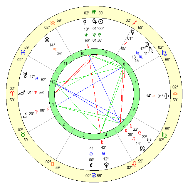 | Moon | 12 Scorpio 18 | 28 Virgo 57 | 15 Cancer 22 |