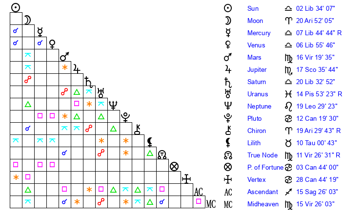 | Mars | 16 Virgo 20 | 2 Scorpio 57 | 21 Scorpio 36 |