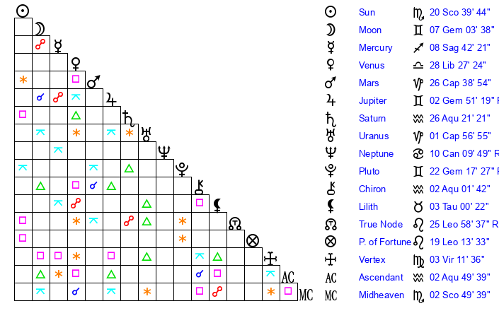 | Pluto | 22 Gemini 18 | 1 Aquarius 35 | 20 Gemini 44 |