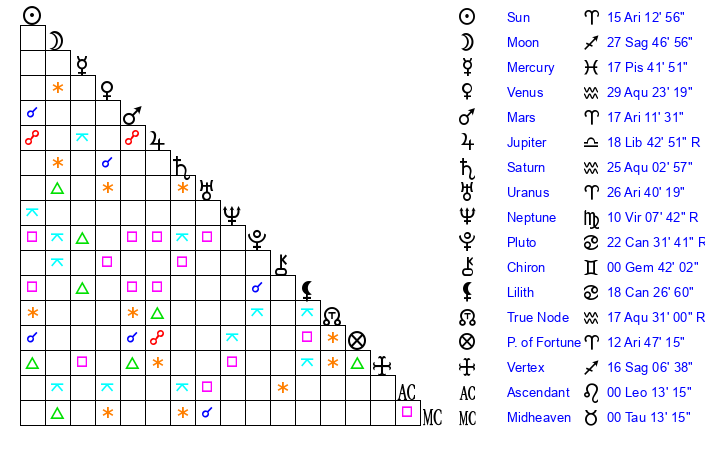 | Sun | 15 Aries 13 | 16 Aries 9 | 12 Cancer 57 |