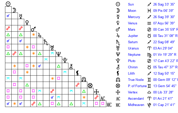 | Sun | 26 Sagittarius 34 | 27 Sagittarius 16 | 3 Aries 34 |