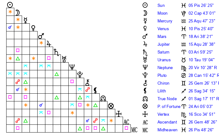 | Sun | 5 Pisces 26 | 6 Pisces 20 | 0 Gemini 55 |