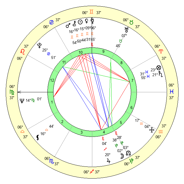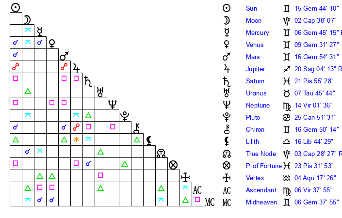 | Sun | 15 Gemini 44 | 16 Gemini 12 | 10 Virgo 57 |