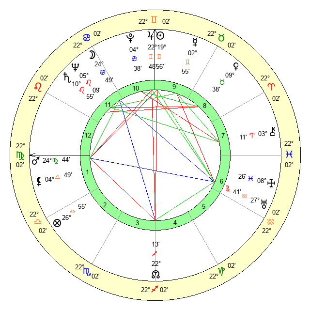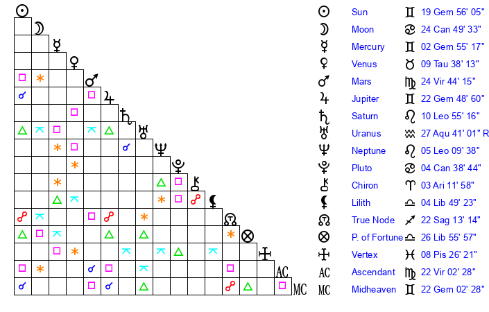 | Sun | 19 Gemini 56 | 21 Gemini 1 | 2 Libra 47 |