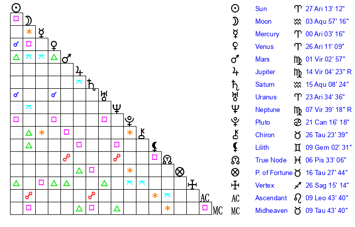 | Moon | 3 Aquarius 57 | 19 Sagittarius 7 | 11 Gemini 58 |