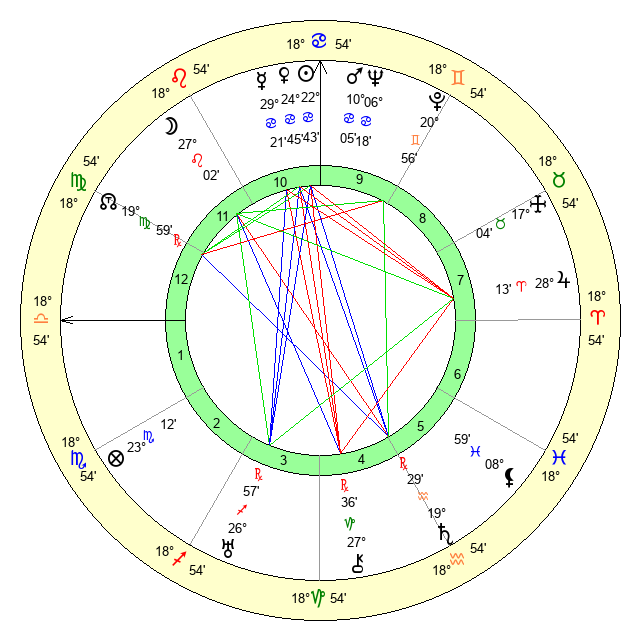 | Sun | 22 Cancer 44 | 23 Cancer 27 | 20 Scorpio 54 |