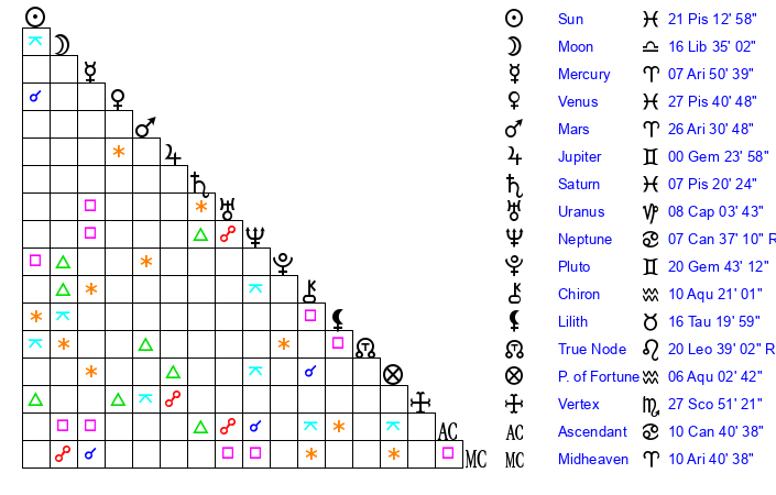 | Moon | 16 Libra 31 | 4 Virgo 33 | 2 Pisces 53 |