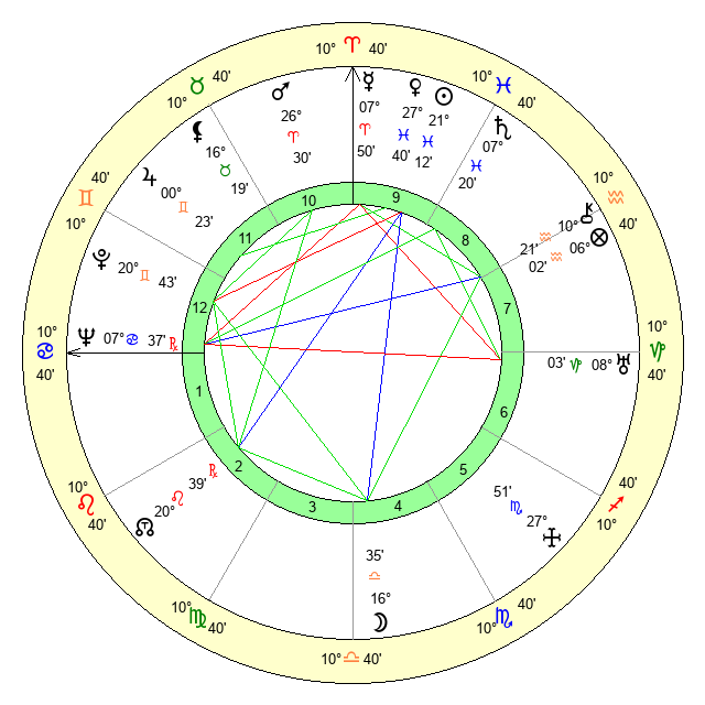 | Neptune | 7 Cancer 38 | 29 Pisces 19 | 10 Cancer 23 |