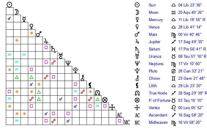| Venus | 28 Libra 41 | 10 Virgo 1 | 16 Aquarius 42 |